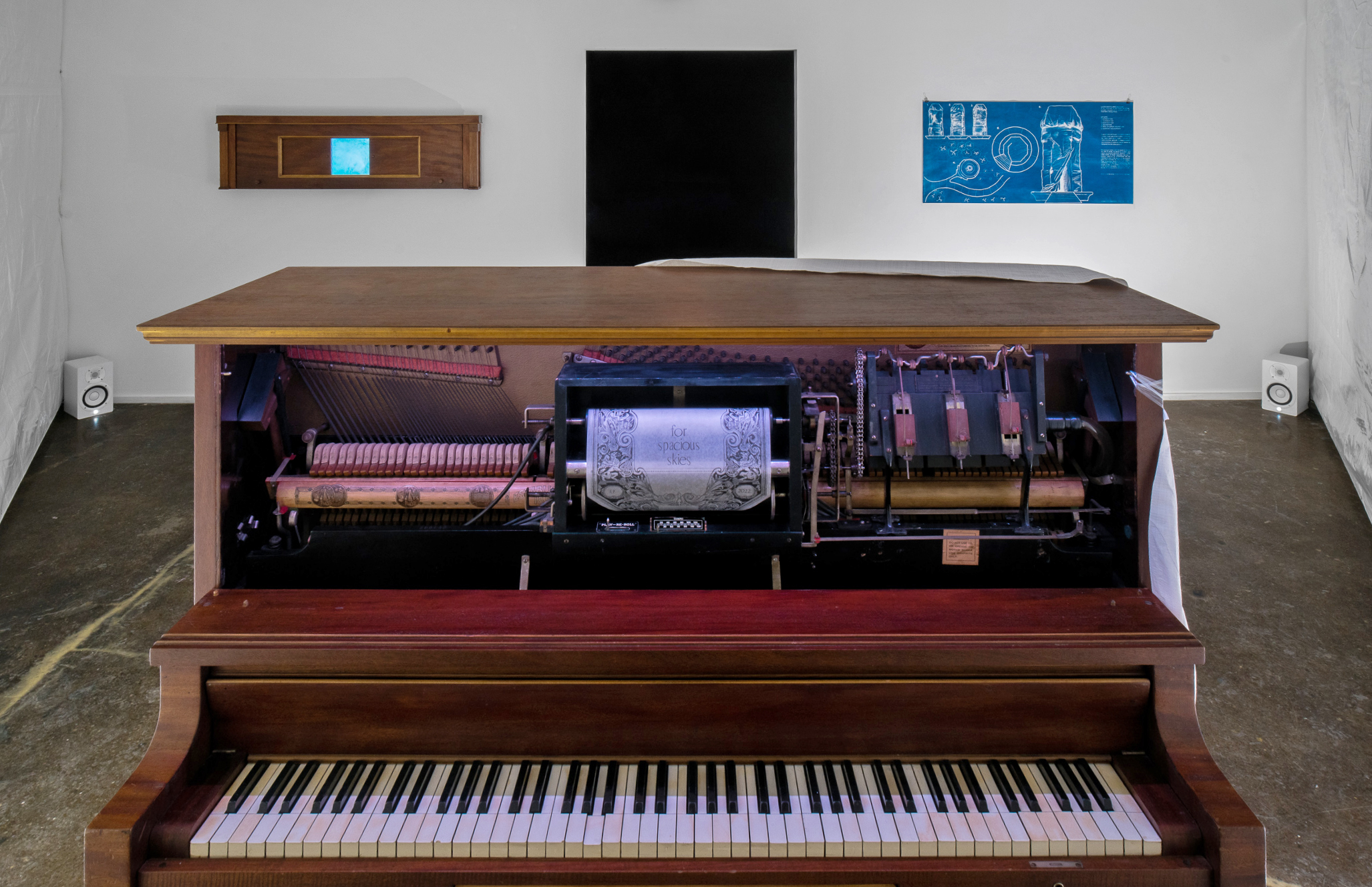 for spacious skies, is an aesthetic field of oblique conversations performed on a player piano that was built in Chicago during a global pandemic which came to be called “The Spanish Flu.” The work is housed within a tarpaulin architecture configured to force a single-point perspective. Research media and the piano’s sound are deployed through the player piano’s apparatus, which interprets a series of drawings I produced of five public monuments that were erected in Chicago between 1889 -1933. A central symbol of inquiry in this exhibition is the fascio, a bundle of sticks. This symbol adorns public monuments to US Presidents Washington and Lincoln, as well as monuments to Mussolini and Columbus. What is at root in the compulsion to gather things together and bind? The fascio is used as a metaphor for people. “Together we are strong,”2 Æsop fabled, but are these sticks conscious of their bondage? Why would one consent to a promise of strength at the expense of their agency to be free?