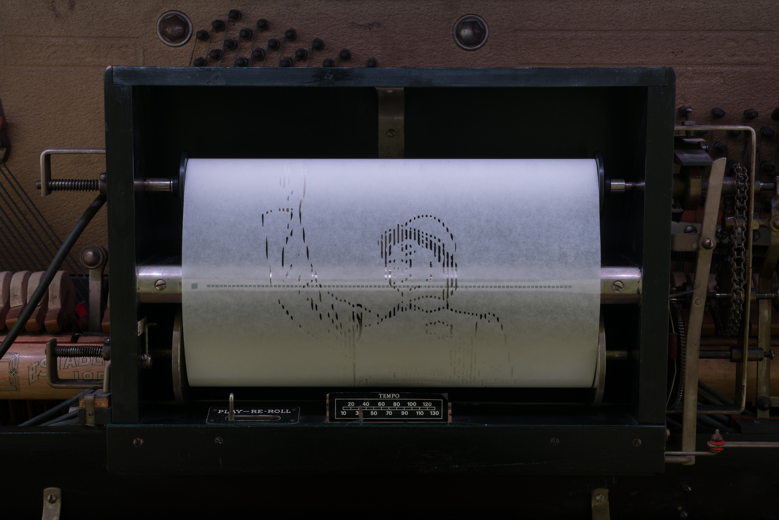 Laser-cut and graphite drawing on player piano roll paper