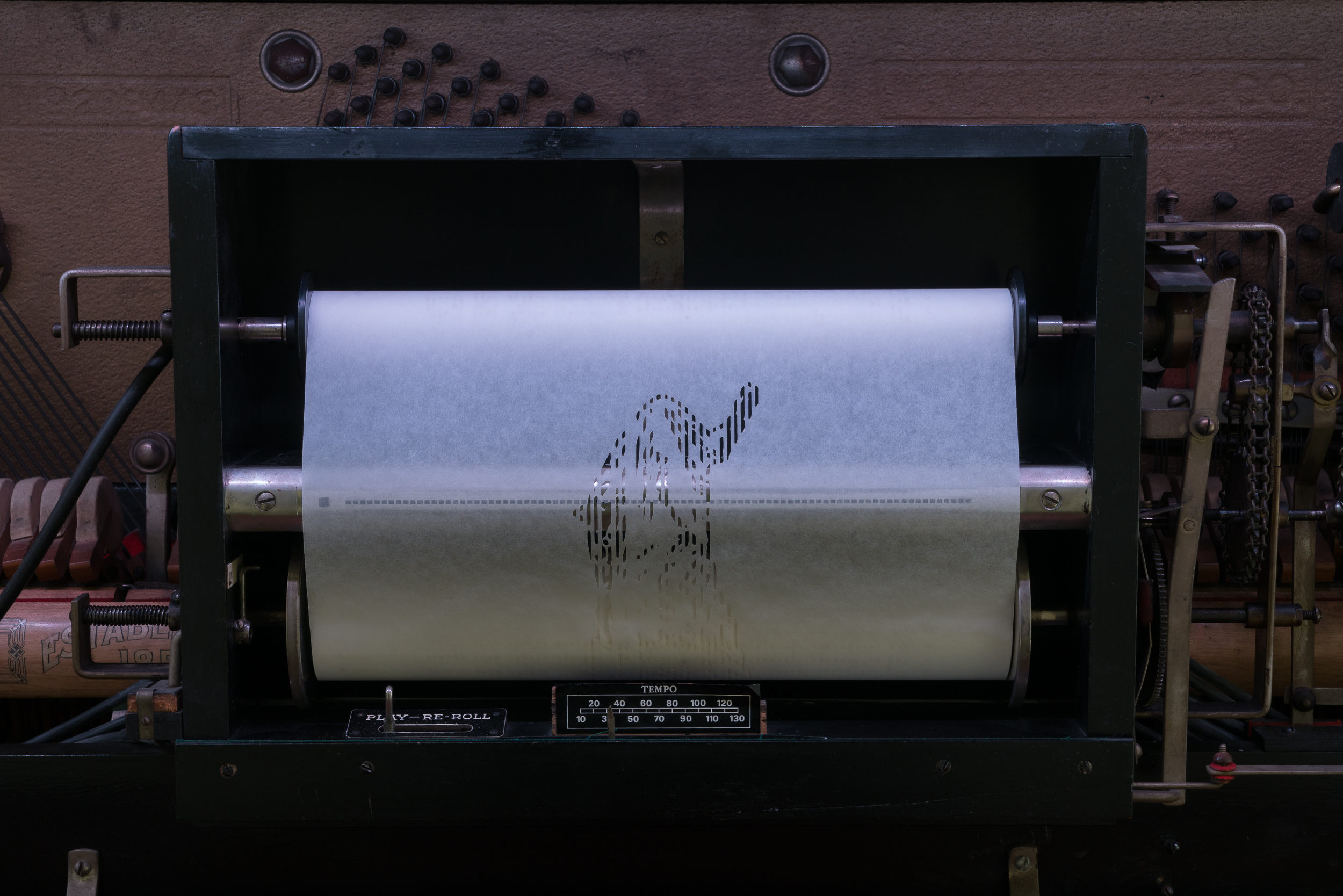 Livestream video of open sky housed in the piano’s player roll window