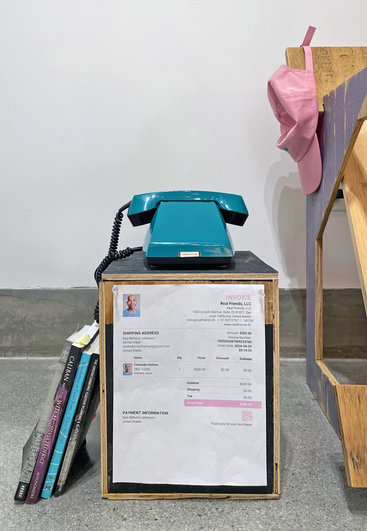Re-wired soviet telephone, folding lounge chair and side table, and contracted labor with Real Friends LLC, Tim Tsang’s friend-for-hire service, providing nurturing friendships through sincere human presence.