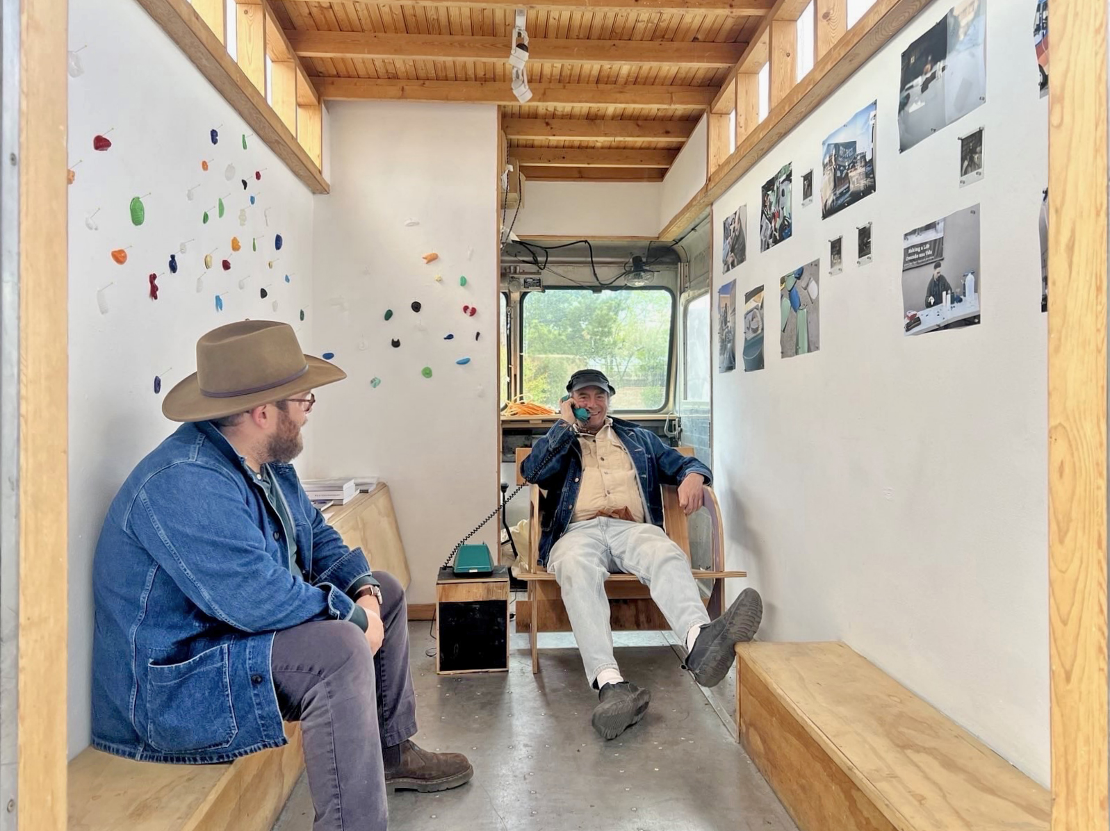 Everything you see here is designed to fold up and fit in the back of a gig-worker’s vehicle. Kyle rented a Chrysler minivan to drive from New York across the US. Starting on Labour Day, May 1st 2024, he stopped in Pittsburgh, Chicago, and Santa Fe before arriving in Los Angeles. One of the first things you might notice in the gallery space is the self-built furniture. You are free to use it, to rest, have conversations, fun, or have a snack. To add, there will be meals organized throughout the course of the show. Bringing together new and old friends around food connects to previous projects of Kyle’s for whom “[t]he only worthwhile reason to make art, or to do anything for that matter, is to make friends.”
